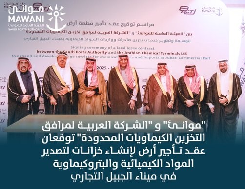 “موانئ” و “الشركة العربية لمرافق تخزين الكيماويات المحدودة” توقّعان عقد تأجير أرض لإنشاء خزانات بميناء الجبيل التجاري