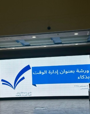 ضمن أنشطة وحدة الأنشطة الطلابية – شطر الطالبات بكلية الفيحاء الأهلية بالجبيل قدّم نادي إدارة الأعمال اليوم الخميس الموافق ٤ ديسمبر، الساعة 11 صباحًا ورشة مميزة بعنوان “إدارة الوقت” بإشراف الأستاذة منى، ومشاركة مجموعة من طالبات النادي المبدعات.