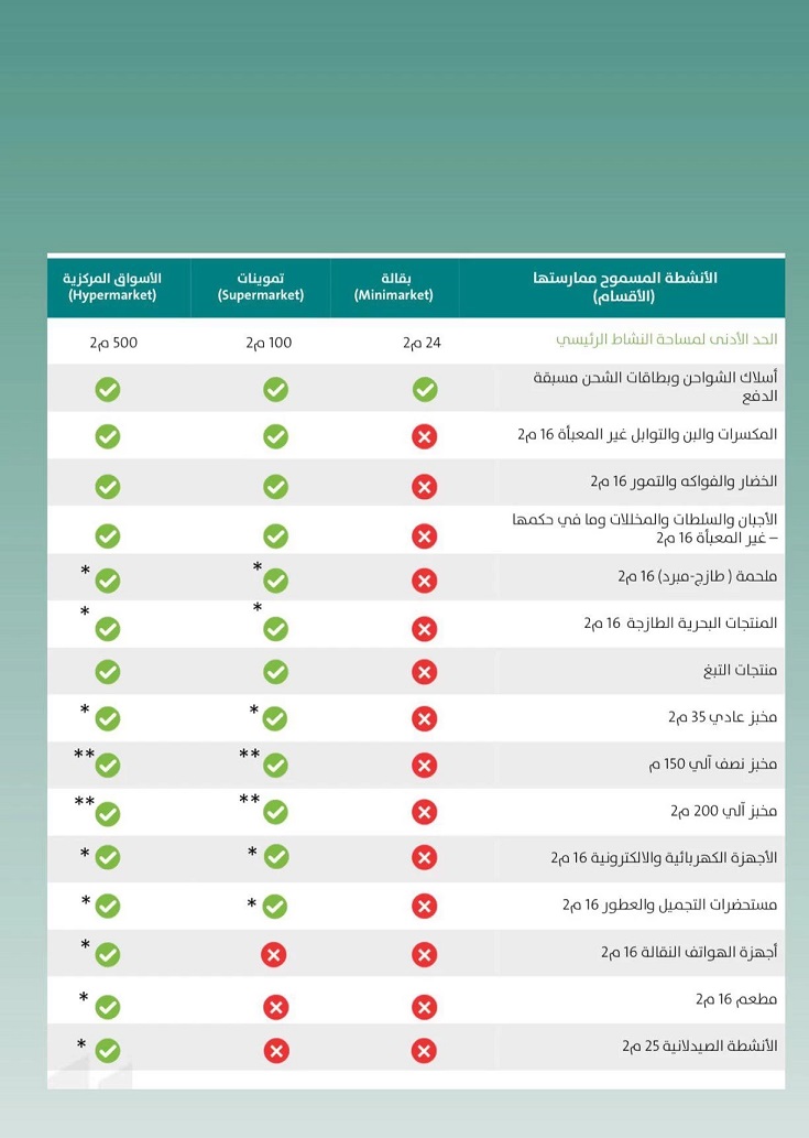 كما اشترطت الوزارة ألا تقل مساحة البقالة عن 24 مترًا مربعًا، مع إلزام التموينات والأسواق المركزية بمساحات تبدأ من 100 م² و500 م² على التوالي. ويتم تخصيص مساحة لا تقل عن 16 مترًا مربعًا لأي نشاط إضافي داخل المحل، على أن يحصل على ترخيص مستقل لكل قسم (مثل الخضار، اللحوم، الأجهزة، وغيرها).