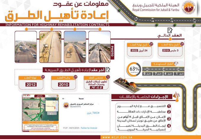 للتوضيح هناك برنامج واضح لاعادة تأهيل الطرق حسب المرفق واخر تأهيل تم على الطريق كان قبل عشر سنوات والاجراءات المعمول بها تضمن ايجاد البدائل والتنسيق والاعلان المسبق، والمشروع ينفذ حسب الجدول المعد له. pic.twitter.com/cjDjPifxno— بندر إبراهيم الخريف Bandar Alkhorayef (@BAlkhorayef) November 15, 2021