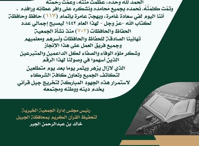 أعلنت الجمعية الخيرية لتحفيظ القرآن الكريم بمحافظة الجبيل، وصول عدد الحافظين لكتاب الله للعام 1442هـ لـ 117 حافظاً وحافظة, من بينهم اصغر حافظة عمرها 9 سنوات, واكبر حافظة عمرها 63 سنة..