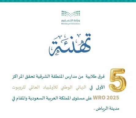 حققت (5) فرق طلابية من مدارس المنطقة الشرقية المراكز الأولى في النهائي الوطني للأولمبياد العالمي للروبوت WRO 2025 على مستوى المملكة والمقام بمدينة الرياض.