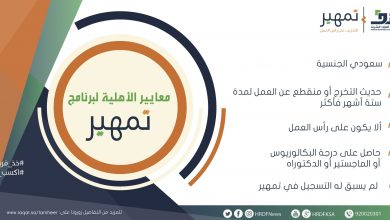 حدد صندوق تنمية الموارد البشرية (هدف)، معايير الأهلية لبرنامج التدريب على رأس العمل (تمهير)، تتضمن أن يكون المتقدم سعودي الجنسية،…