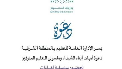 ينفّذ تعليم الشرقية سلسلة من لقاءات برنامج “أسرة مطمئنة”، الذي يستهدف أمهات أبناء الشهداء ومنسوبي التعليم المتوفين.