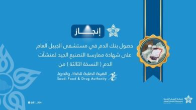 بنك الدم في مستشفى الجبيل العام يحصل على شهادة ممارسة التصنيع الجيد لمنشآت الدم