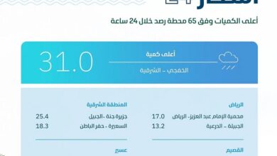 سجلت منطقة الشرقية أعلى معدل لكميات الأمطار بـ31,0 ملم في محطة رصد الخفجي، ضمن رصد 4 مناطق شهدت هطول أمطارٍ…