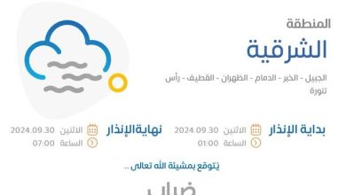 نبه المركز الوطني للأرصاد من ضباب على الجبيل والخبر والدمام والظهران والقطيف ورأس تنورة خلال ساعات الصباح الباكر يوم الاثنين،…