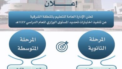 أعلنت الإدارة العامة للتعليم بالمنطقة الشرقية عن تنفيذ اختبارات تحديد المستوى الوزاري للعام الدراسي 1447هـ للمرحلتين المتوسطة والثانوية. يمكنكم الاطلاع…